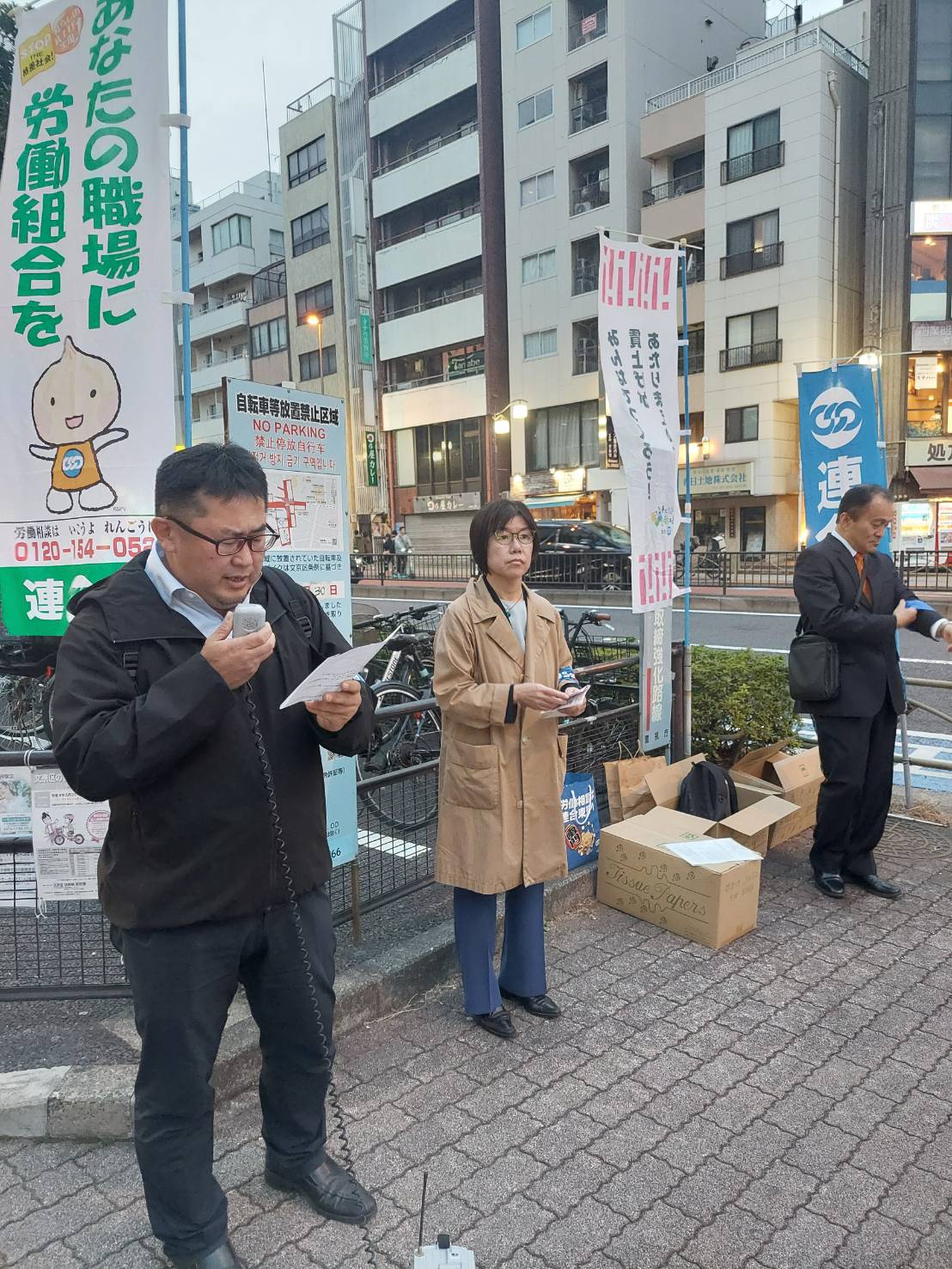 石井議長代行(ヤマト運輸労働組合)、羽田事務局長(東京交通労組軌道支部)、山本かずひと文京区議会議員、真島連合東京地域・組織アドバイザーによるマイクリレーのなかで、2026春闘の妥結状況、春闘の意義・必要性、連合なんでも労働相談ダイヤルの取り組みについて、本郷三丁目駅交差点を行き交う方々に、ポケットティッシュを配布しアピールしました。