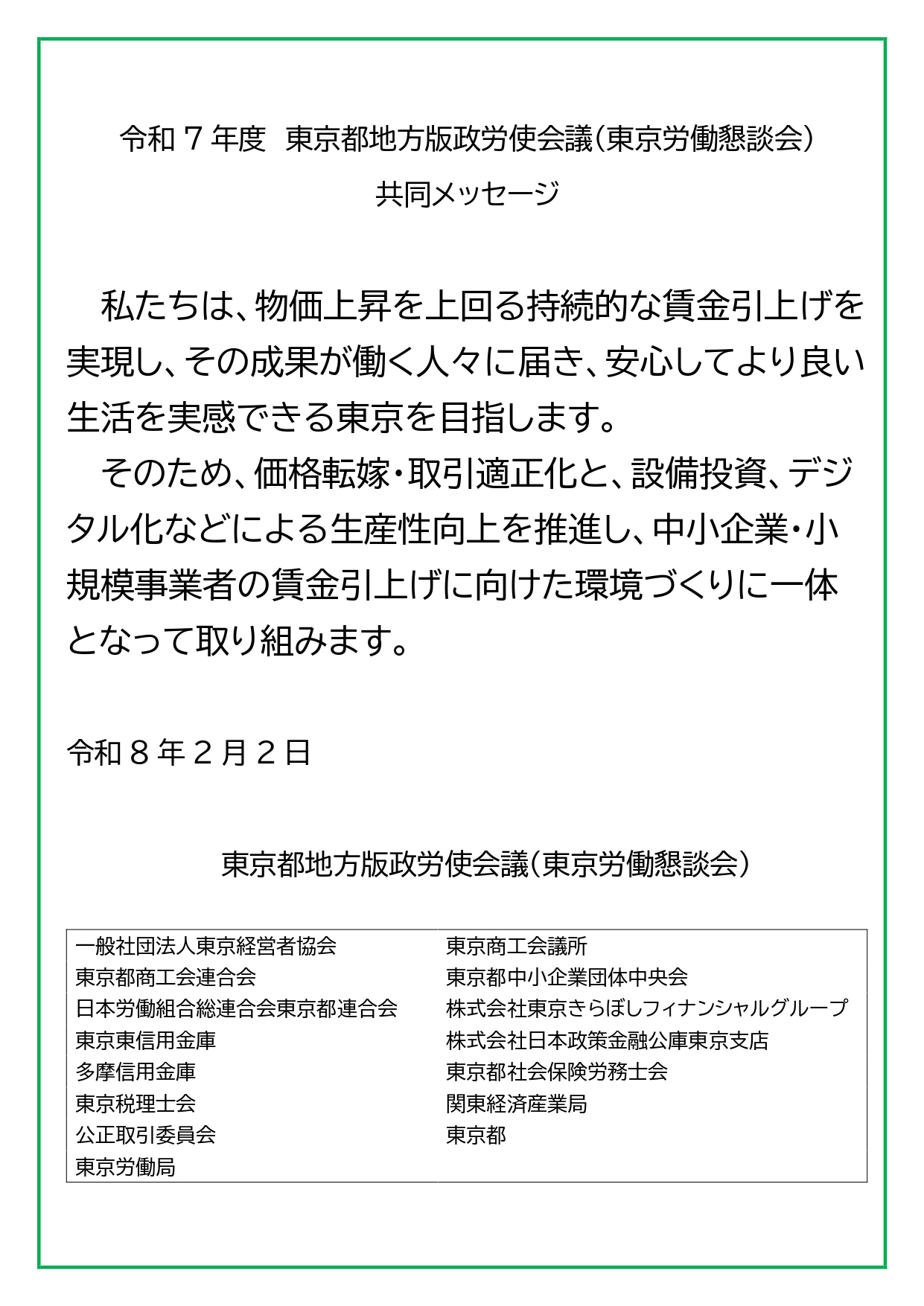 2月2日、連合東京は、東京都、経営団体および関係機関で本年の賃上げに向けた取り組みをテーマとして、東京都地方版政労使会議(東京労働懇談会)を開催しました。