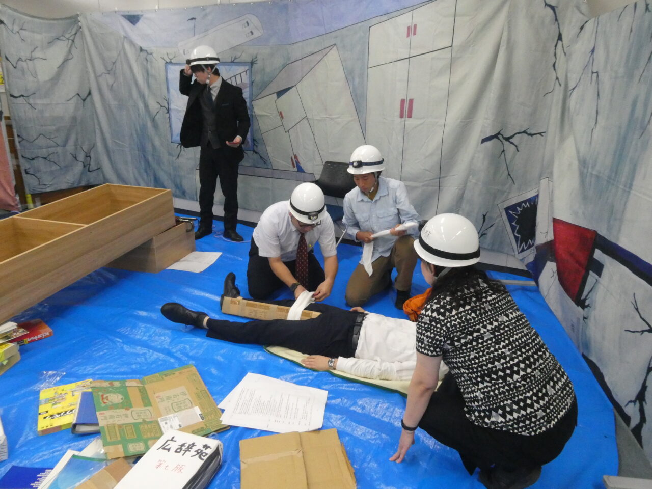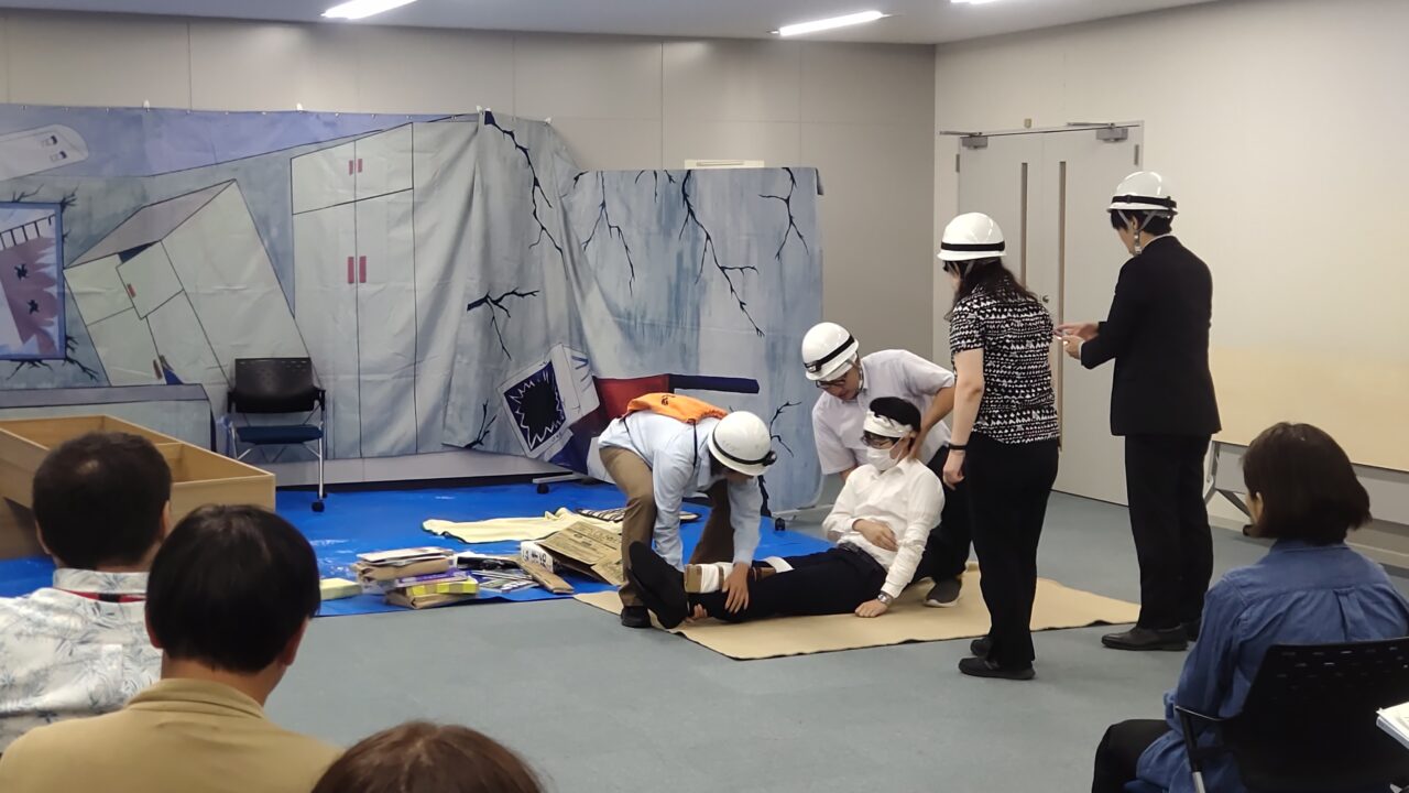 冒頭、VSCメンバーによる救出劇が行われました。災害時に必要な救出法・応急手当・搬送法を一連の流れを学ぶことができます。職場で地震が発生した場合に、その場にいる人でチームを組んで、物に挟まって身動きができなくなっている人や怪我をしている人を救出する方法を具体的にイメージすることができます。この救出劇は代々VSCメンバーが引き継いで行っているもので、今年度はVSCメンバーの熱演で特に臨場感たっぷりに災害時の緊張感が表現され、VSTメンバーはその過酷な状況に圧倒されていましたが、怪我をしている人の救出が完了した時には感動の拍手も巻き起こり、大きな実感を得る事ができたのではないかと思われます。