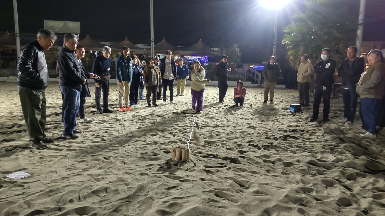 宴の後半には、岡本瞬祐さん(2023年度・印刷労連)のご指導・審判による班対抗モルック大会も行われ、優勝賞品をかけて、大いに盛り上がりました。
