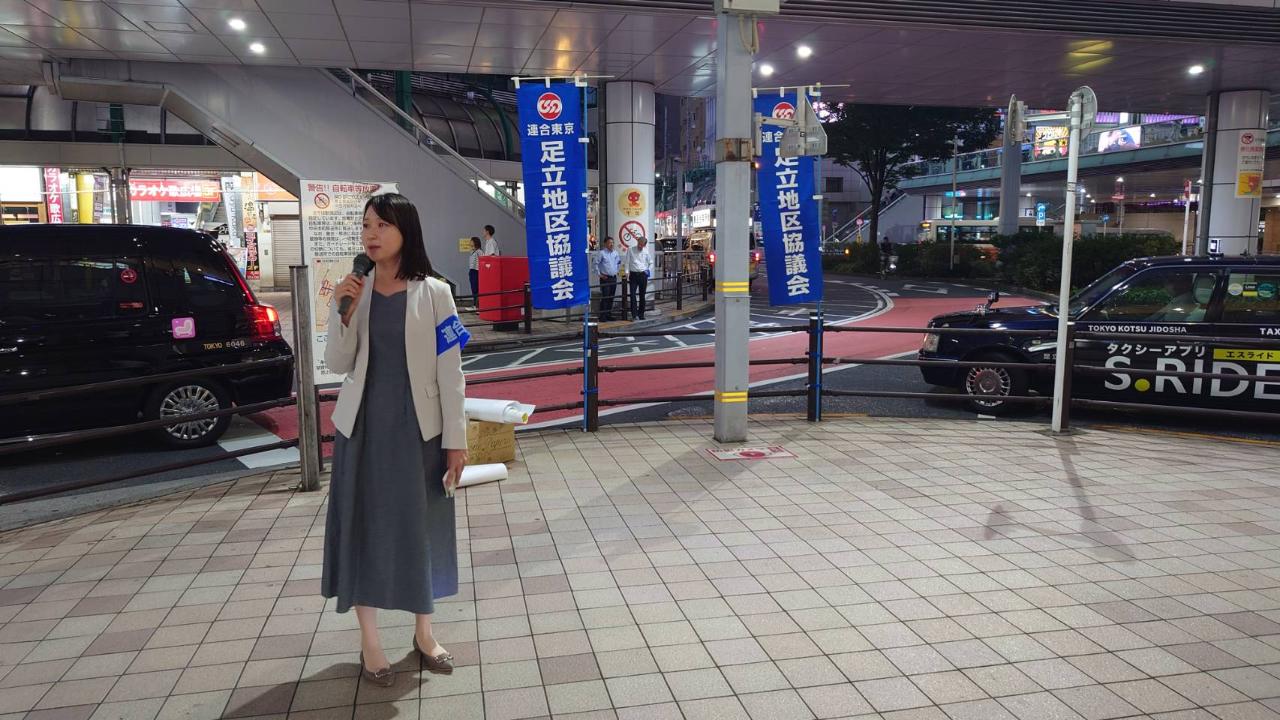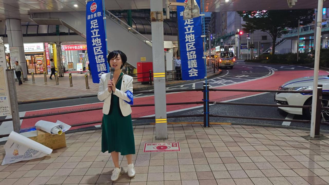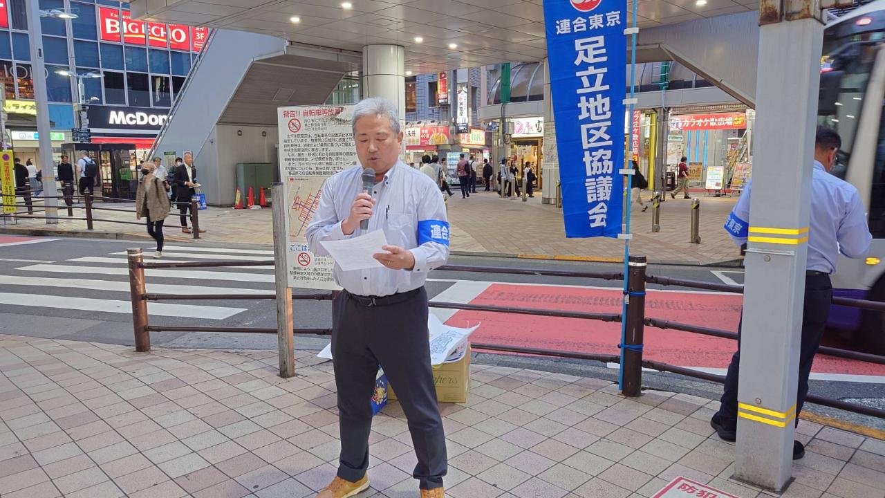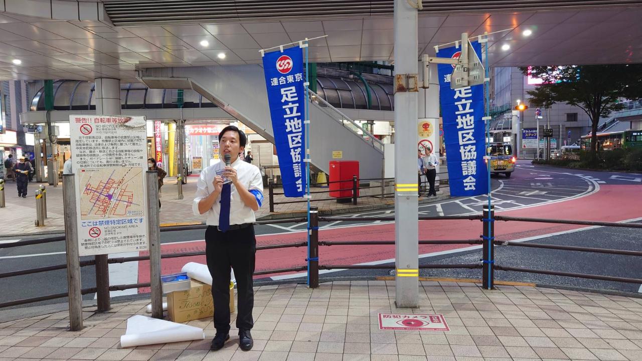 当日は、北野事務局長の進行で、山本議長、藤原連合東京副事務局長、森衆議院議員、後藤都議、銀川都議とでのリレー形式で訴えを行いました。