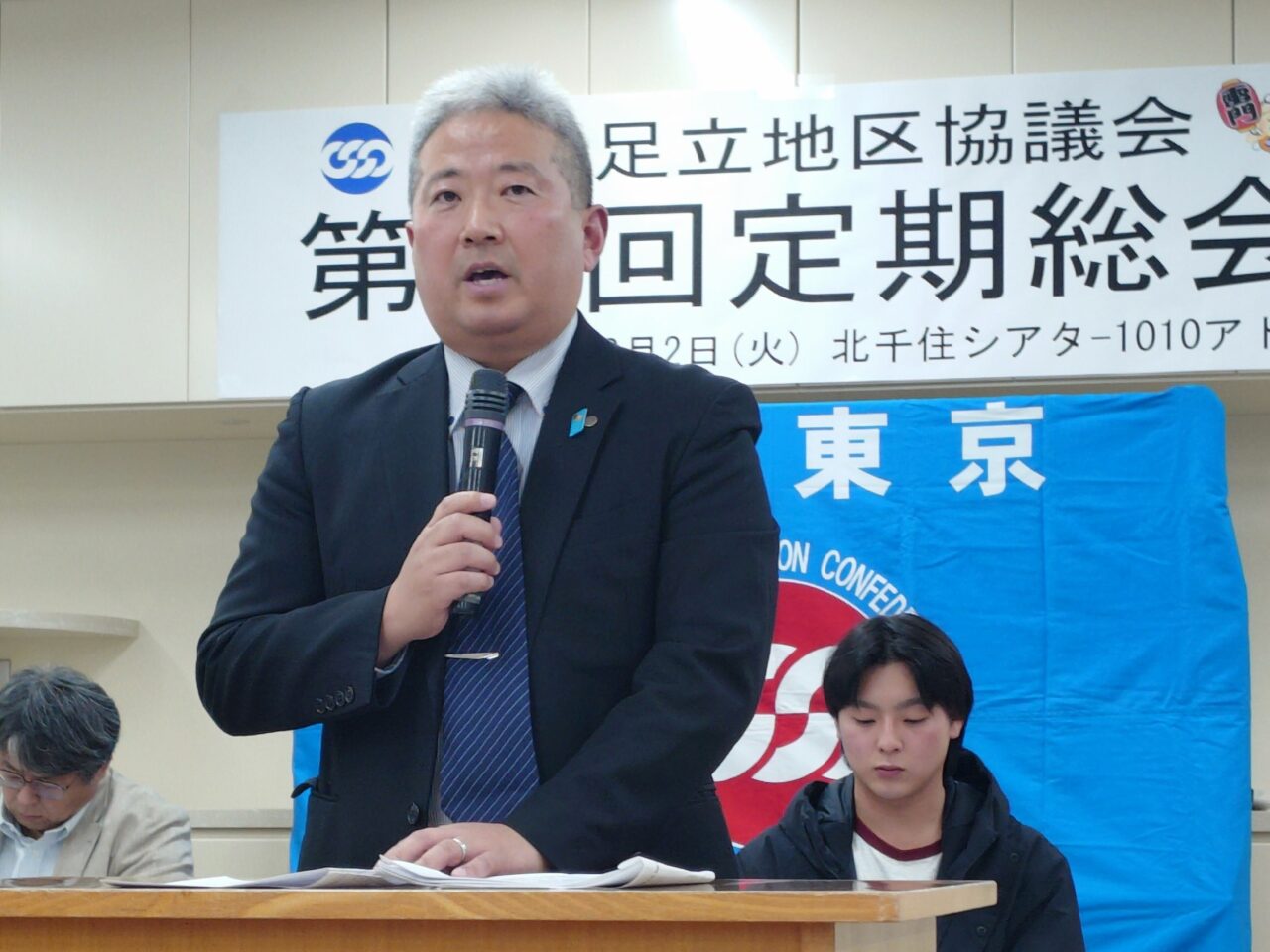 来賓も多数お越しになり、連合東京東部ブロック地協浅見議長、望月議長代行、東京都労働相談情報センター木寺所長、森衆議、小椋区議、中央労働金庫千住支店土田支店長、こくみん共済coop東部支所山﨑支所長から、それぞれご挨拶をいただきました。