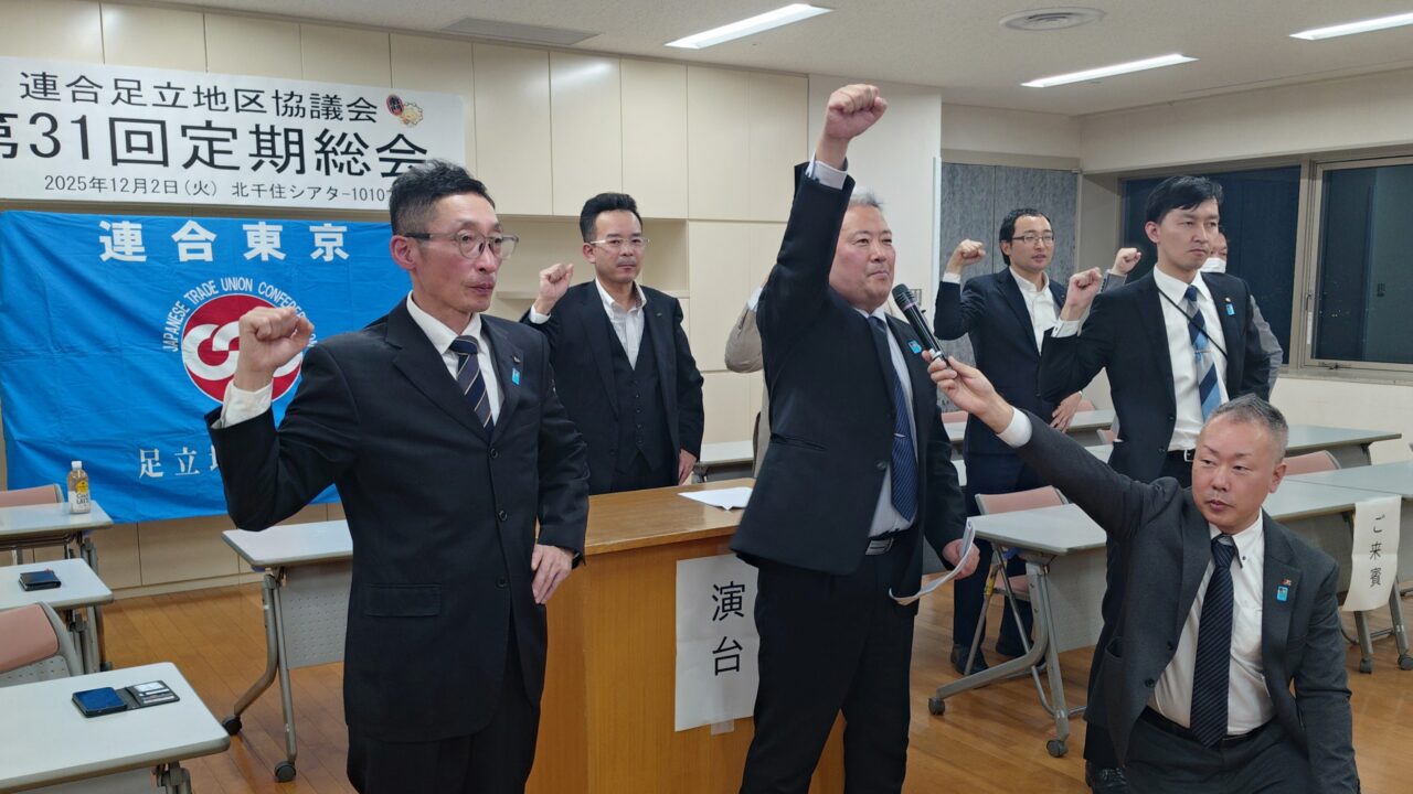 連合足立地区協議会は12月2日(火)18時20分から北千住シアター1010アトリエにて「第31回定期総会」を開催し、役員、定期総会代議員、来賓合わせて総勢50名が参集しました。