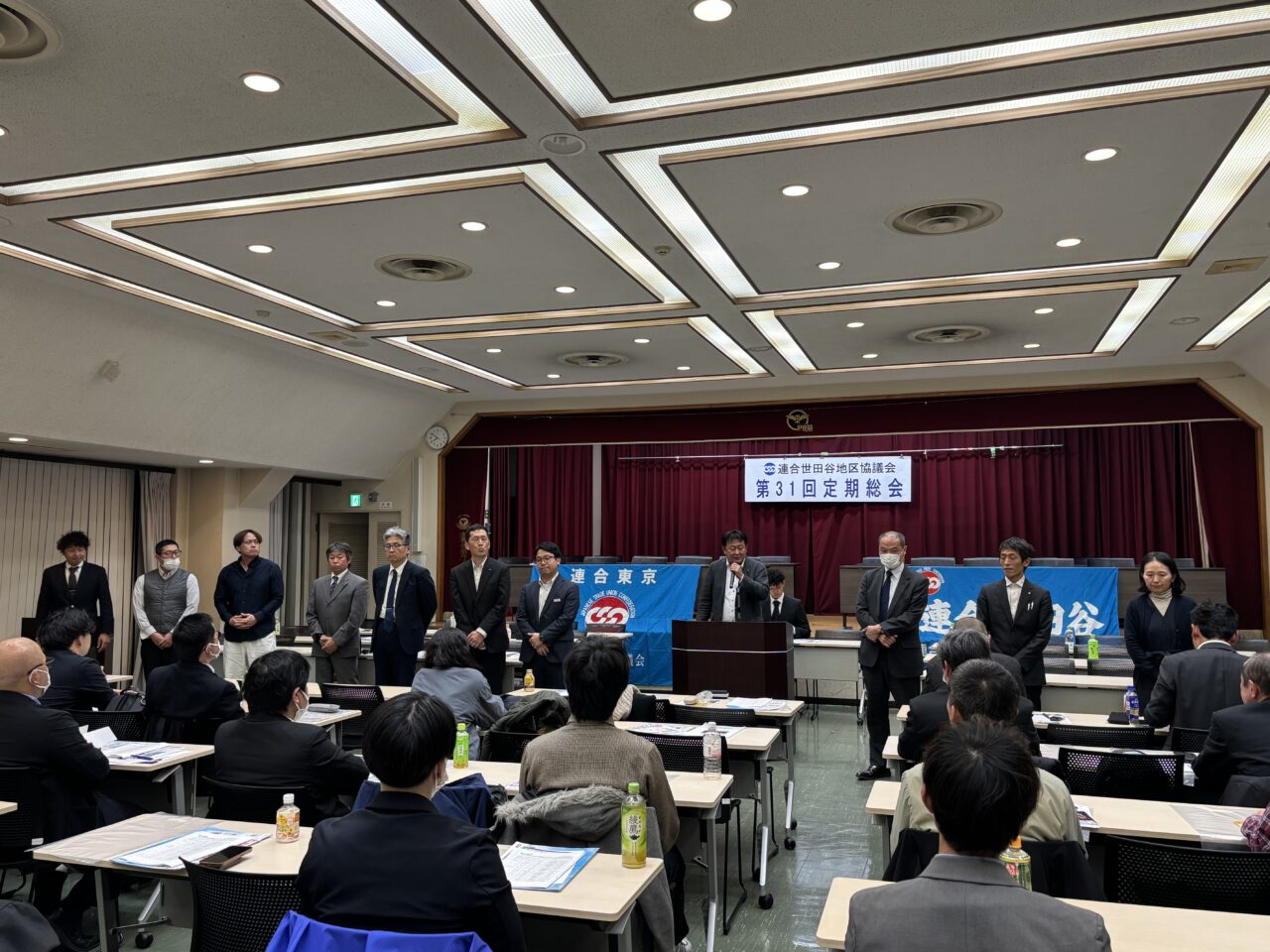12月5日(金)、連合世田谷地区協は東急労働会館にて第31回定期総会を開催しました(参加者49名)。冒頭、望月連合世田谷議長より、今年1年間の出来事(道路陥没事故、大阪万博、選挙、デフリンピック等)を振り返ったあと、2026春闘に向けた意気込みや、地域に顔の見える活動の継続に触れ、主催者挨拶をしました。