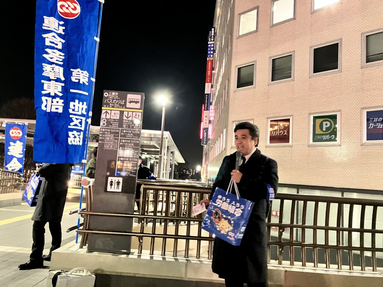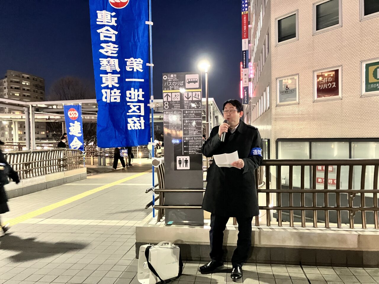 2月13日夕方、三鷹駅南口にて連合多摩東部第一地区協議会は「2026春季生活闘争街宣行動」を実施しました。