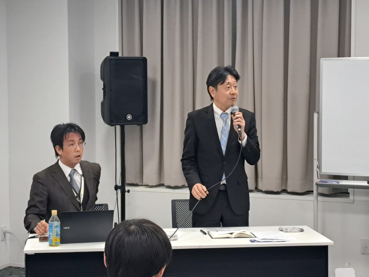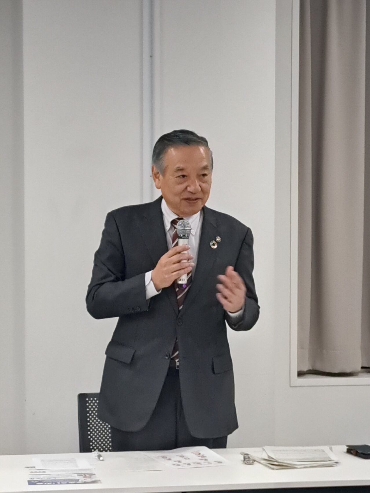 続いて、阿部裕行多摩市長、しのづか元多摩市議会議員からご挨拶をいただいたのち、阿部裕行多摩市長より市政報告をいただき、「命を守る、地域を守る、仕事を守る」の方針で全国初となる市内家電事業者からの購入を対象とした、高齢・低所得者向けエアコン購入補助金の創設や多摩市の発展・課題解決に向けた取り組みについて伺いました。