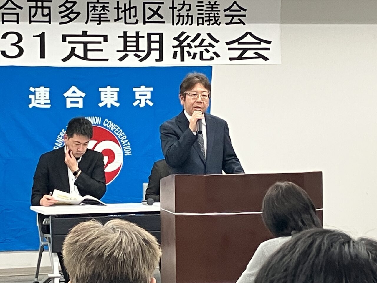 総会は土屋 久之 副議長の司会で始まり、主催者を代表して熊谷 浩伸 議長は「西多摩地区協では、今年も地域ミーティングを開催し、働く者の声を都や自治体に申し入れを行ってきた。とりわけ推薦都議が2名おり、身近な存在として東京都に対していろいろな要望を届けやすくなってきた。一方で、物価上昇がここまであるとは予測できなかった。今年以上の賃上げが必要で、しっかり対応していかなければならない。西多摩では熊対策が課題となっているが、政策・制度要請の際に各首長に対して対応策を申し入れてきた。引き続き、推薦・友好議員と連携し政策制度の実現に取り組んでいく」とあいさつを行いました。