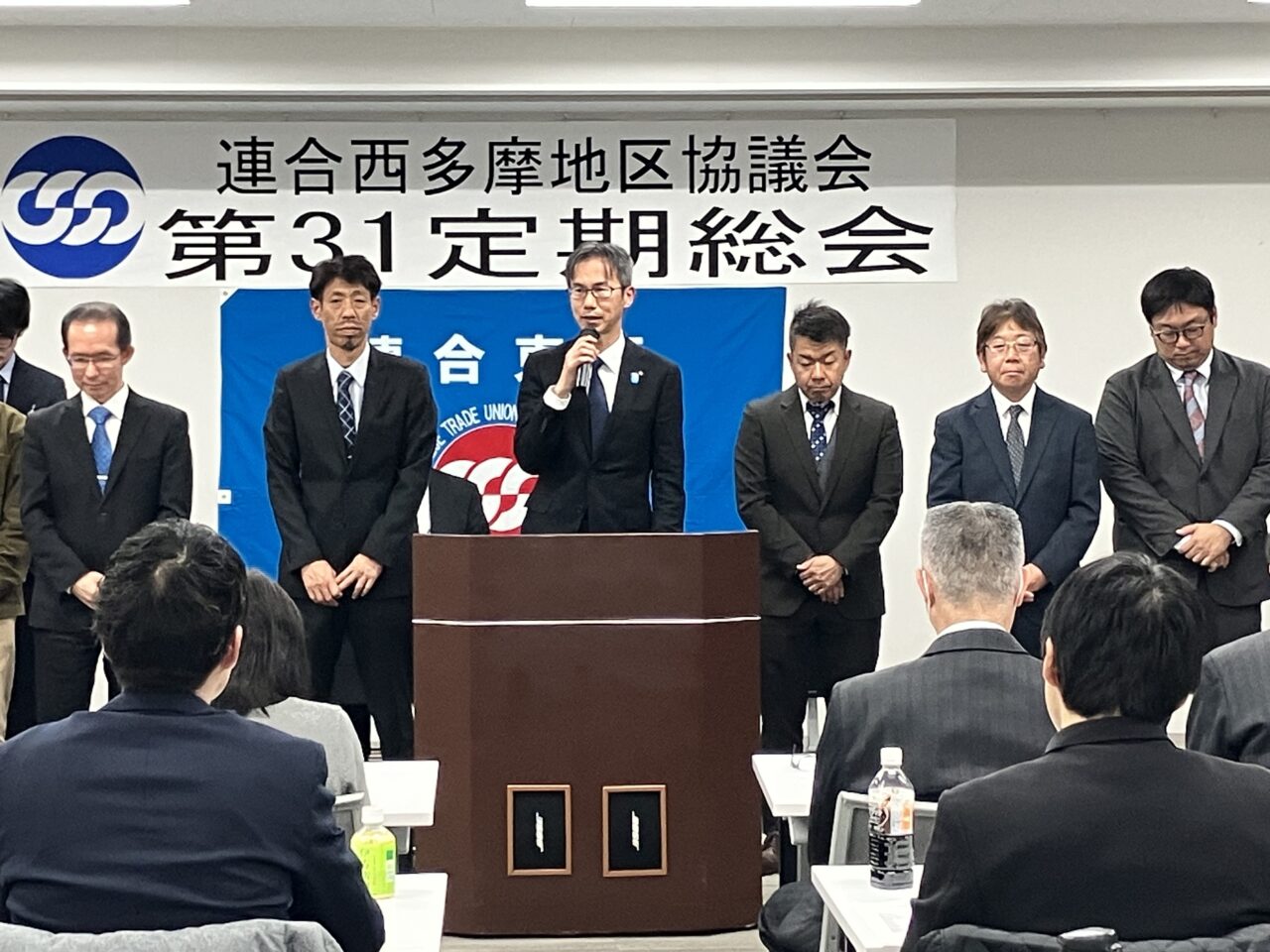 第1号議案 2026年度活動方針(案)及び活動計画(案)を来住野 篤 議長代行、第2号議案 2026年度会計予算(案)を下野 剛 事務局長、第3号議案2026年度連合西多摩地区協議会役員体制・各種審議委員(案)を桜井 哲史 副議長がそれぞれ提案し、各議案とも満場一致で承認されました。新旧役員紹介、あいさつが行われ、