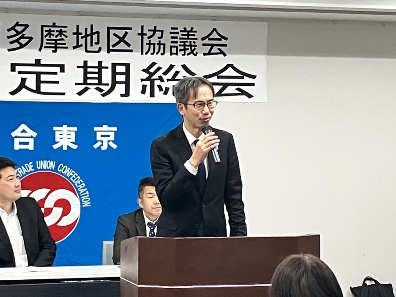 来賓として、三多摩ブロック地協 小林 昭浩 事務局長、推薦議員を代表して森村 隆行 東京都議会議員からそれぞれ、ご挨拶をいただきました。さらに、連合東京 金子 富紀 労働局長、中央労働金庫西多摩 佐野 靖 支店長、こくみん共済coop多摩支所 天野 実 支所長、片谷 洋夫 青梅市議会議員、馳平耕三 羽村市議会議員、中村 則仁 あきる野市議会議員の皆様を紹介しました。