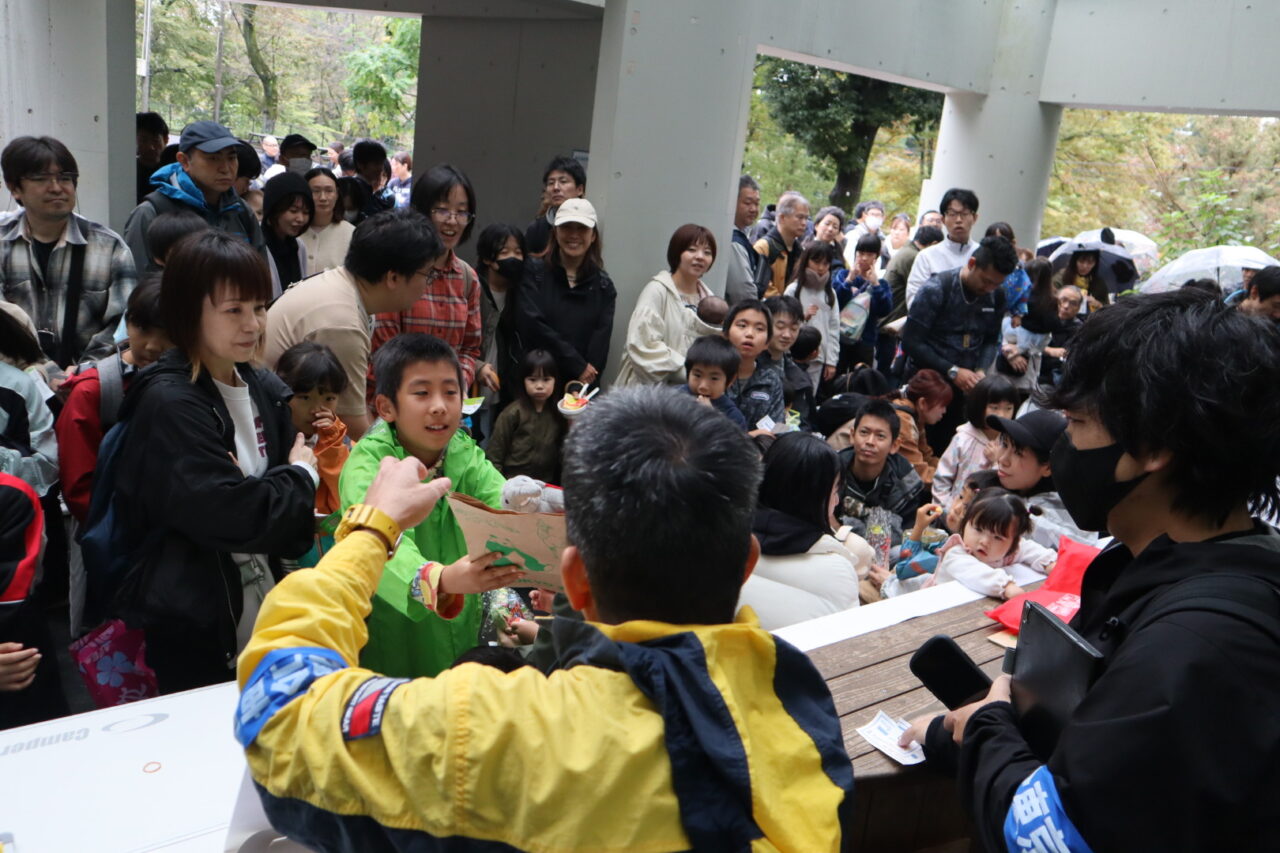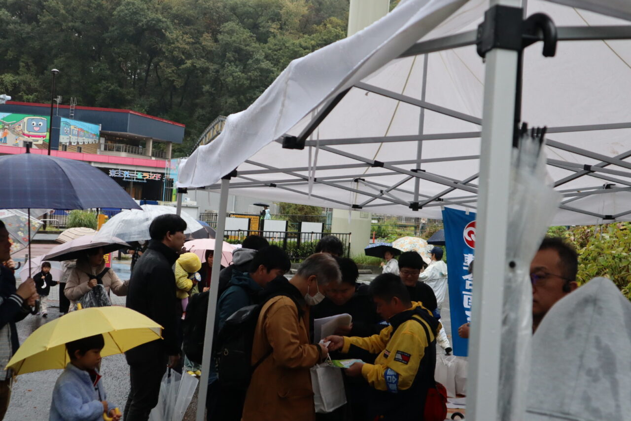 当日はあいにくの雨模様でしたが、受付開始から多くの組合員とご家族が来園されました。入園券・お菓子・「こどもを守るネットワーク」PRチラシと定規をお渡しし、皆さん足早に園内へ。抽選券を入れる際、「当たりますように」と願っていたお子さんたちの姿がとても印象的でした。