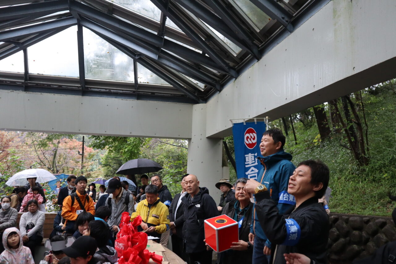 11時20分から「はやし広場」にて、お楽しみ抽選会を行いました。森田事務局長の司会で開会し、髙澤議長から「生憎の雨にもかかわらず、多くの皆さんにご参加いただきありがとうございます。ご家族や組織で交流を図って楽しい時間をお過ごしください」と挨拶がありました。続いて、中嶋・島谷日野市議会議員からもご挨拶をいただき、「こどもを守るネットワーク」のPRも行いました。