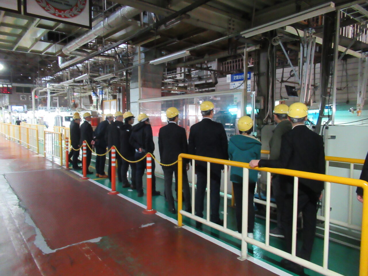 まず初めに、羽村工場での作業内容などについてのレクチャーを受け、その後、工場内の見学を行いました。次々と流れてくる車の部品を組み立てる工程では、同じ車種・同じ作業の方が効率的と思われがちですが、実際には一台一台異なる仕様に瞬時に対応し、即座に判断して迅速に作業を進める作業員の姿に、大変驚かされました。
