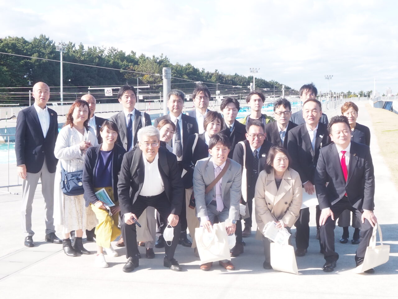 続いて、海の森水上競技場(江東区)では、競技コース、グランドスタンドをはじめ会議室や宿泊室を視察しました。東京都内でも最先端の施設ということで、バリアフリートイレや施設では多摩産材を使用しており、またイベントも多く開催されているとのことでした。