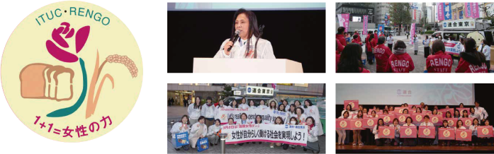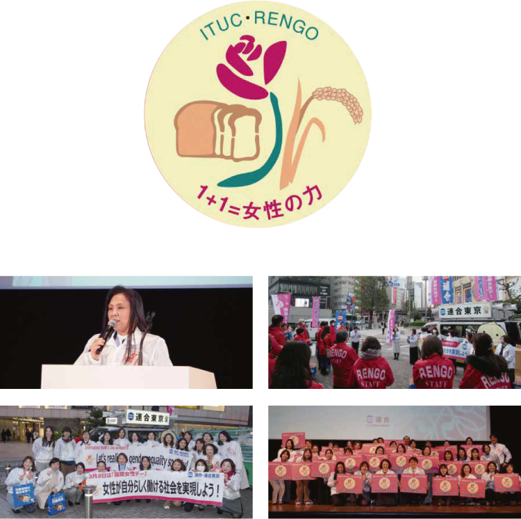 国際女性デーの起源は、1857 年3 月8 日 ニューヨークの被服工場で働く女性たちが低賃金・長時間労働に対して抗議を行ったことにはじまります。その後、国連において、この日は「女性の権利と平等のために闘う記念日」と位置づけられ、賃金・労働条件の向上を表す「パン」と、女性の尊厳・人権の確保を表す「バラ」をシンボルに掲げ、今も世界各国で様々な行動が展開されています。連合・連合東京も世界の女性たちと共に行動します。